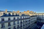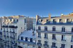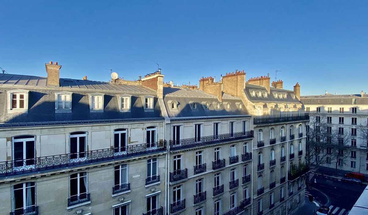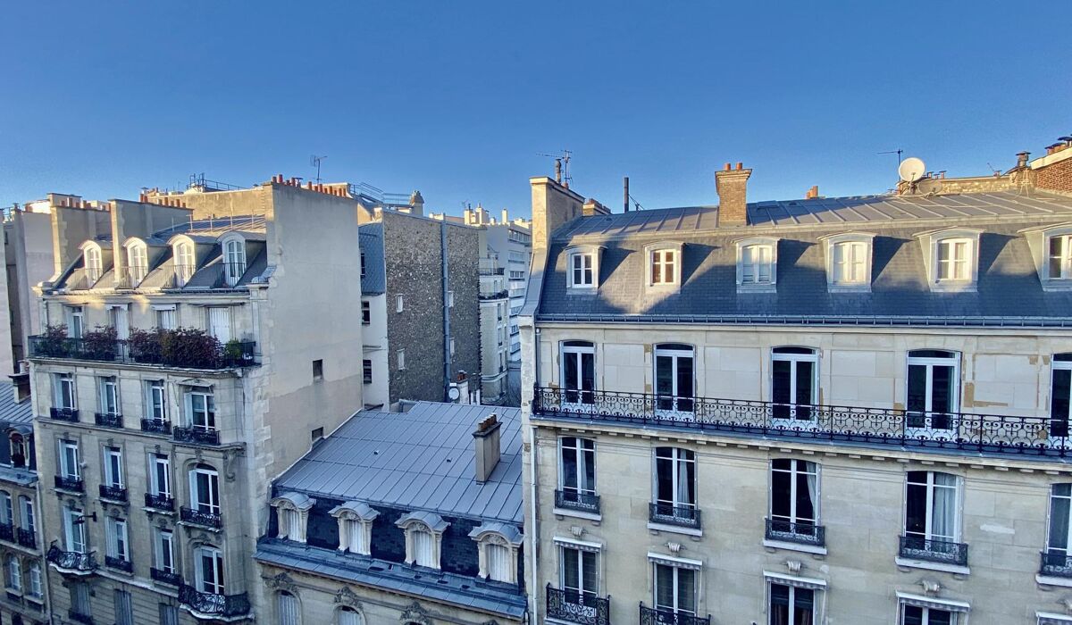 Vue dégagée sur les toits parisiens et les élégants immeubles haussmanniens environnants.